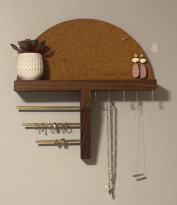 For my wife's birthday, I built this necklace and earring shelf for her out of walnut and corkboard.